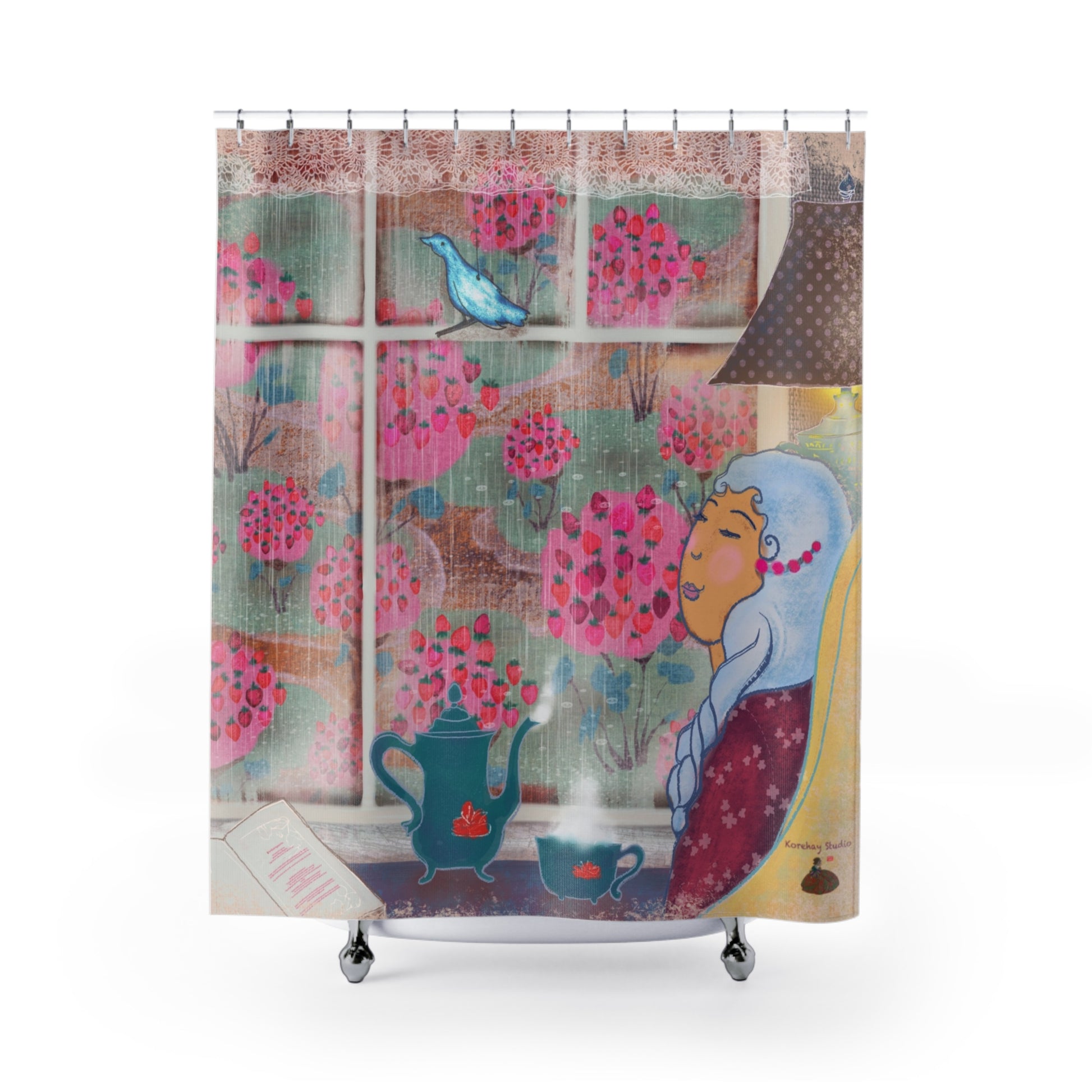 Step into the soft hush of a rainy day in LALATOWN. This shower curtain features the original painting Rainy Window in LALATOWN, a quiet moment of blurred glass, gentle raindrops, and the warm, comforting glow of a town resting under the weather. Designed with LALATOWN’s signature linen-fade edges and cozy storytelling texture, it brings a peaceful, atmospheric mood to your bathroom. A perfect backdrop for slow mornings, warm showers, and the soothing sound of imagined rain. A little window into a gentler world.